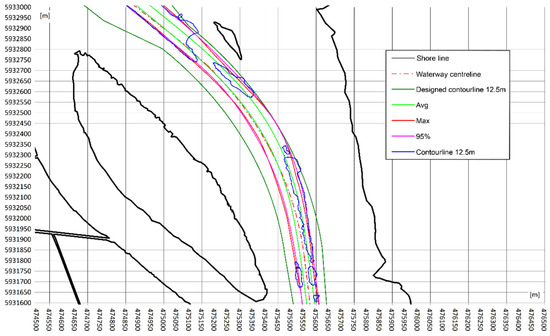 The results of the simulation tests were statistically processed by determining the lanes: maximum, average and at the confidence level (1 − α) = 0.95. Examples of the results of the simulation tests of the bulk carrier with LOA = 200 m on the Ińskie bend performed at a 0.7 knot current and winds of S 10 m/s and W 10 m/s (2 series—24 passes) are shown in Figure 2.