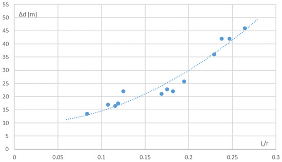 Additionally, according to the regression analysis method, the linear dependence of lane widening on vessel length and turning radius was determined (Figure 4):