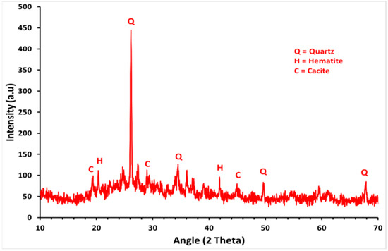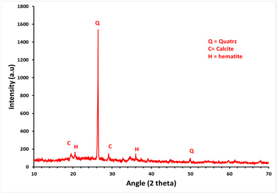 Bricks were manufactured at a local brick kiln using various proportions of WTS (Table 1). X-ray fluorescence (XRF) spectrometry was performed. It was clearly observed that the main constituents of clay were silica, aluminum, and ferric oxides, as shown in Table 1. Furthermore, X-ray diffraction (XRD) diffractometer was conducted to determine the phase composition of clay (Figure 1). WTS was obtained from the Rawal Lake treatment plant, located at Rawalpindi, Pakistan. The chemical composition of water treatment plant sludge (WTS) was identified by using the X-ray fluorescence (XRF) spectrometer, as shown in Table 2. The main constituents of the sludge were iron, aluminum, and silicon oxides. The phase composition of WTS was identified by XRD analysis (Figure 2). To reduce the concentration of suspended solids below 20%, dewatering of sludge was carried out using sand filtering technique. Filtered sludge was subjected to air-drying under sunlight for at least 15 days. Figure 3 shows the sand filter and spreading of WTS on drying bed. The dried WTS was pulverized using pestle. The powder was then sieved using ASTM designated sieve set. Figure 4 exhibits scanning electronic microscopic (SEM) images of WTS and clay. These images show that the particles of clay and WTS were irregular in shape. The clay particles were found to be lesser than 100 µm in size. Table 3 shows the results of presence of leaching toxicity in Clay and WTS samples. The leachate was determined via atomic absorption spectrometry (AAS). Results show that the content of Cu, Pb, Cr, Zn, and Ni present in WTS samples was higher compared to clay. The content of these heavy metals present in clay and WTS samples was within threshold limits specified by USEPA.