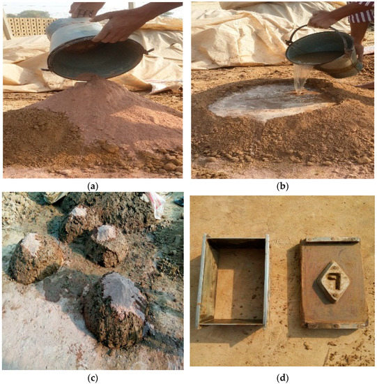 Mixing of raw materials. (a) Clay mixed with WTS, (b) addition of water, (c) wet mixing, (d) wooden mold.