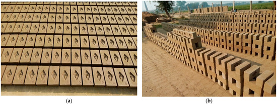 The mixture containing clay, WTS, and water was poured into molds of conventional sizes, which had dimensions of 228 × 114 × 76 mm. The freshly molded bricks were then left in the open to dry for a couple of days. During this process, these bricks were turned over to facilitate uniform drying from all surfaces. After two days of sun drying, the bricks were fired in a kiln at a temperature of 1000 °C for a duration of 36 h. Further, after 45 days, the specimens were taken out from the kiln. Figure 5 shows the mixing process while Figure 6 shows the fabrication process of bricks in an industrial kiln.