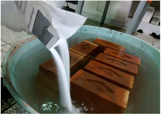 The durability of specimens was also examined by fully dipping the bricks in a sulfate solution (Figure 7). The sulfate solution was prepared by mixing 50 g of sodium sulfate per liter of water. After 30 days, bricks were taken out from the solution and oven-dried at 110 °C. After 24 h, they were taken out of the oven and weighed again. Bricks were then capped and tested to determine the compressive strength variation. Furthermore, a simple regression analysis has been carried out on the experimental results.