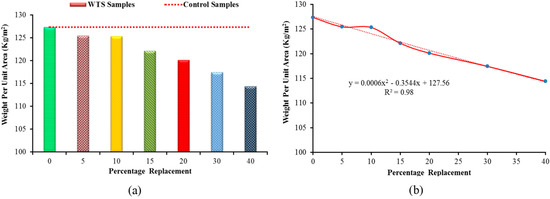 Weight per unit area of bricks producing WTS. (a) Experimental results, (b) emperical results.