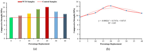 Figure 9a shows the experimental results of the compressive strength of tested bricks. The reported values are the average of five specimens with a coefficient of variation (COV) less than 3%. This COV value is similar to that reported in an earlier study [27]. Control brick specimens showed a compressive strength of approximately 9.5 MPa. An increasing trend with the increasing percentage of WTS was observed. For example, an approximately 10% increase in the compressive strength of bricks manufactured using 5% WTS by weight of clay was observed compared to the control specimen. The increase in strength may be attributed to the crystallization process that might be ensured by an increased firing process, which closes the open pores in the brick specimen incorporating WTS. In specimens beyond 20% of WTS, a reduction in compressive strength was also observed (Figure 9a). This reduction was due to a higher amount of WTS, which reduced the adhesiveness of the mud/clay, leading to an increase in the internal porosity of bricks.