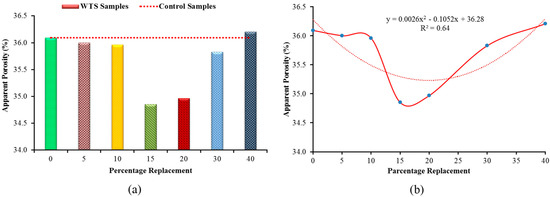 Apparent porosity test results for bricks producing WTS. (a) Experimental results, (b) emperical resuts.