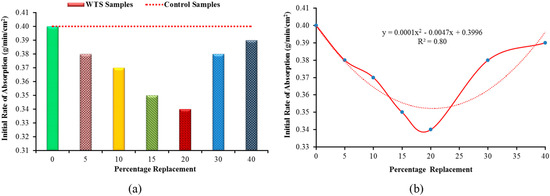 Experimental values are used to produce the empirical findings shown in Figure 13b. The initial rate of absorption for each proportion of WTS used in brick manufacturing was calculated using an empirical Equation (6). The R2 value is equal to 80%, indicating that the empirical findings are in excellent agreement with the experimental data.