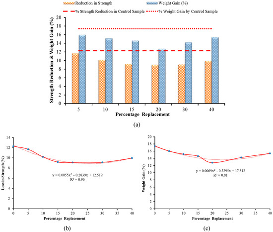 Figure 14b,c demonstrate the empirical results of the loss in compressive strength and gain in weight, respectively, of the WTS bricks. The empirical Equations (9) and (10) are given below. For the compressive strength reduction of the brick samples, the R2 is equal to 96%, and for the gain in weight, the R2 is 81%, respectively, confirming the good compliance of the obtained empirical results with the experimental results.