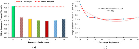 The freeze and thaw durability of bricks is influenced by the interaction of used materials and climatic conditions. During the freeze–thaw cycle, the water present in pores freezes and tends to expand. As a result of this expansion, damage to the brick is occurs if the volume of the pores that are expanding is more than the volume of the pores that it is contained within. The experimental outcomes of the weight loss of brick specimens with different dosages of WTS due to freeze and thaw cycles are shown in Figure 15a. It is indicated that the percentage of weight loss decreases with an increase in the percentage of WTS. For all the samples, the percentage of weight loss was less than one. No cracking was observed in any specimen after 50 freeze and thaw cycles. All the brick specimens showed that weight loss was under the ASTM C67 range of 3%. A specimen may be considered a failure if weight loss increments by 3% or it cracks during the freeze and thaw cycle in accordance with ASTM C67. Damage due to freeze and thaw is dependent upon the porosity of the brick specimen. High pore volume specimens exhibited higher stresses, leading to the decreased durability-related properties of the brick.