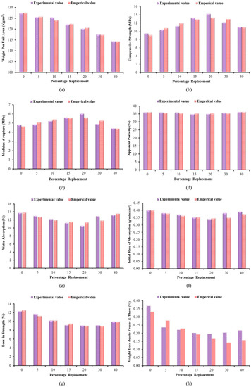 A comparison of the experimental results and empirical results for: (a) weight per unit area, (b) compressive strength, (c) modulus of rupture, (d) apparent porosity, (e) water absorption, (f) initial absorption rate, (g) loss in compressive strength due to sulfate attack, (h) weight gain due to sulfate attack.