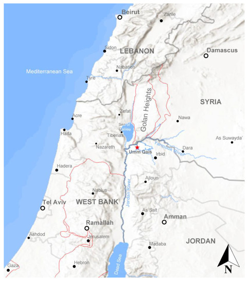 Figure 1. Map showing the location of Umm Qais/Gadara close to the current contested borders (in red) within the Levant region.