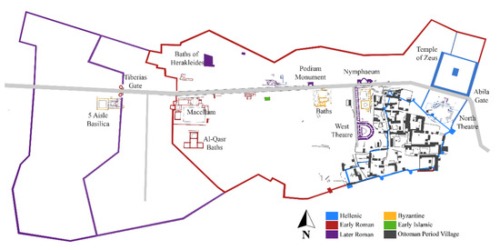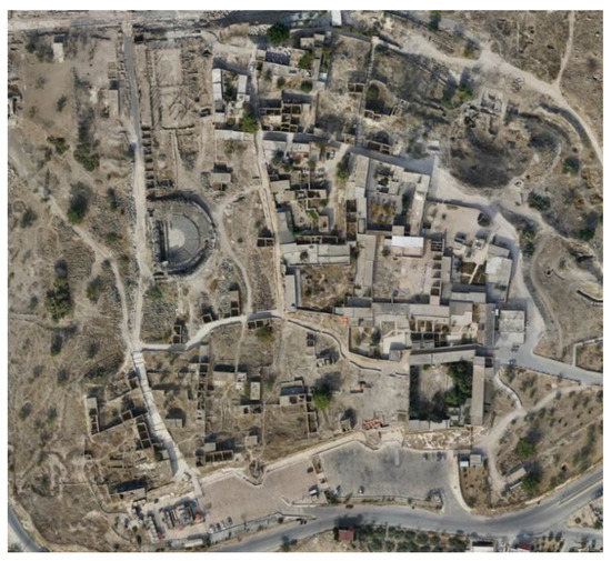 The village of Umm Qais is located c.120km north of Amman in the northwest of Jordan (Figure 1). The village was built on top of and from extensive archaeological remains of a city whose foundation in the fourth century BCE was named Gadara, a Greek version of a local Semitic name meaning fortress [13]. Umm Qais/Gadara was registered on the Tentative List of the UNESCO World Heritage Sites in 2001. It exemplifies the multi-layered complexity of cultural influences that have marked this region over the last two and a half millennia: Greek, Roman, Byzantine, Islamic and Ottoman influences have all left their mark on the location, and the extant remains of the ancient city include theatres, temples, churches, bathhouses, tombs, markets and shops all arranged on a street plan formed either side of the main east–west road connecting the eastern Mediterranean port cities to Arabia and southern Syria (Figure 2). The present community’s historical accounts refer to an influx of tribal families to the area during the mid-nineteenth century and construction of the current courtyard houses in the Upper Quarter (Harat al-Fouqa) utilizing the supply of dressed stone from the archaeological remains of ancient Gadara [14]. The reuse of earlier walls as foundations meant that the village had a more structured layout compared to other rural Ottoman settlements, and the decorative reuse of Gadara’s contrasting grey basalt and white limestone gave the site its characteristic architectural appearance.