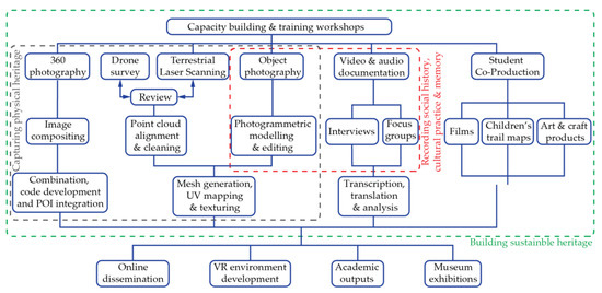 The collected images were later processed using both Metashape and the freely available Meshroom to generate the digital 3D models. Skills and knowledge training enabled local members to continue their own production of 3D digital resources and helped establish the crowdsourcing of this digital archive by both tourist visitors and local community members alike.