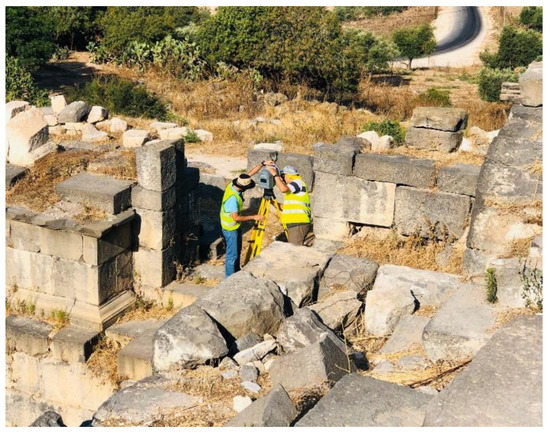 With a site of such scale and complex topography, a series of systematic surveys, terrestrial laser scanning, drone-mounted and aerial photography enabled us to capture the full 3D data of the site from almost all angles. The central areas of ancient Gadara and the adjacent Ottoman houses were scanned using a Trimble TX8 terrestrial laser scanner that provides a full 360° × 317° field of view, collecting 1 million points per second. Distance measurements were determined by the time of flight of an invisible infrared laser (1.5 µm wavelength) for surface distances in the range of 0.6 m to 120 m. Level 2 laser scans with a point spacing of 11.3 mm at 30 m were recorded in standard mode at multiple scan locations used to cover the full extent of the site and to overcome occluded areas from each of the scanning stations (Figure 4).