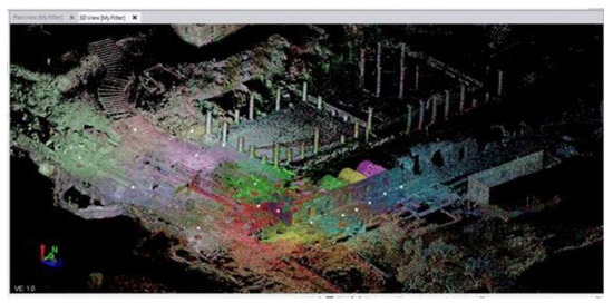Point cloud models derived from each scan station were each imported into Trimble Realworks (Trimble Inc., Sunnydale, CA, USA) and registered using the cloud-to-cloud registration to generate an aligned surface point-cloud of the atrium, octagonal church, cardo street and shops, western theatre and the adjacent Ottoman houses (Figure 5). The site was divided into six investigative areas allowing the results of the archival research to be considered prior to laser scanning whilst also reducing the RAM and VRAM and processor loads for each area to streamline the workflow of all subsequent steps. Once successfully registered and fine aligned, the point clouds from each of the scan stations were merged into a single cloud before being subdivided into point clouds covering each of the six archaeological areas.