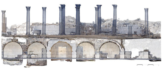 Figure 6. The central section of the north–south elevation image of the Byzantine monuments on the earlier Roman terrace showing the Byzantine octagonal centralised church above the Roman Cardo street and vaulted shops of ancient Gadara. Image generated from the cleaned 3D point cloud.