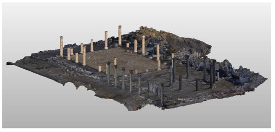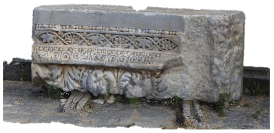 During the training, we demonstrated the process by recording nine different objects, with an average of 90 images per object. Objects were chosen due to their known historical significance or for the potential of their utilization within the Point Cloud model produced from the laser scanning mentioned above; for instance, our team identified a piece of marble decoration (Figure 11) that was a part of a repeated element from the Nymphaeum at the side of the Decumanus Maximus (the east–west-oriented Roman street). This piece was then photographed in high quality and the 3D model was duplicated and repeated to illustrate the Roman Nymphaeum.
