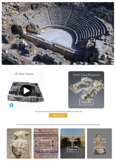Figure 13. Building up a multifaceted virtual platform for the Living Museum of Umm Qais. (©2021 www.UmmQaisHeritage.com, accessed on 14 January 2022). Top: Virtual walk through the Western Theatre. Above: Multiple virtual experiences of the museum, artefacts from different historical eras.