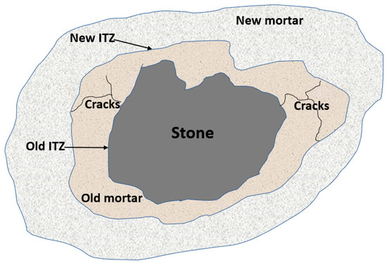 Recycled aggregate is formed of two Interfacial Transition Zones (ITZ), one between the natural aggregate and the old cement matrix and the other between the old cement matrix and the new cement matrix [68,69,70]. A schematic diagram of the Interfacial Transition Zones (ITZ) in recycled concrete aggregate is presented in Figure 2.