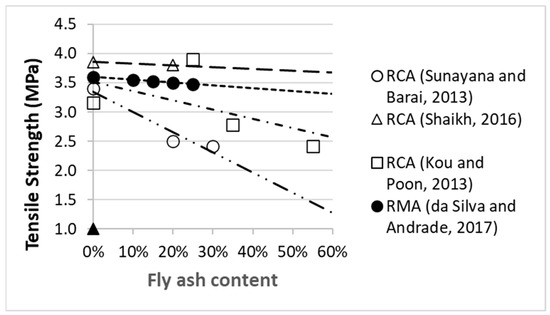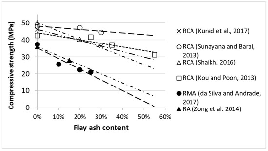 Compressive strength of concrete with: recycled aggregate of concrete (RCA), mixed recycled aggregate (RMA), and ceramic bricks (RA). Data from Zong et al. [7], da Silva and Andrade [17], Kou and Poon [32], Shaikh [33], Sunayana and Barai [34] and Kurad et al. [37].