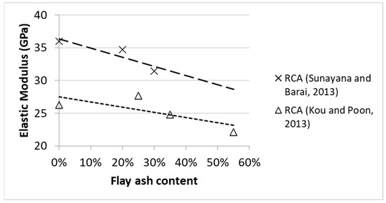Dabhade, Chaudari, and Gajbhaye [5] verified a slight increase in axial compressive strength in concretes with recycled aggregate and with 10% of fly ash compared to concrete with recycled aggregate only. Lima et al. [31] concluded that the addition of fly ash in concretes with recycled aggregate, in general, improves workability as well as mechanical and durability properties, reducing the harmful effects of recycled aggregate.