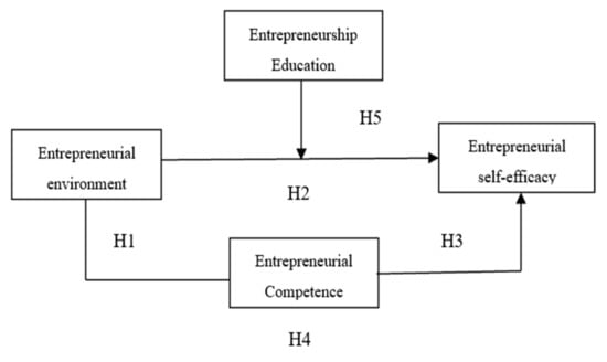 Thirdly, the entrepreneurial environment provides resource support for the development of entrepreneurial competence and drives the improvement of entrepreneurial self-efficacy. The entrepreneurial environment provides support for the development of entrepreneurial competencies and helps college students to obtain social support and provide solid resource conditions for entrepreneurial activities. Comprehensively, the success of entrepreneurship among college students with weak entrepreneurial resources depends not only on themselves, but also on the support of external resources []. With entrepreneurial competence, college students can also expand their own social resources and establish the social support system needed to use entrepreneurship []. Abundant social resources can trigger positive expectations of entrepreneurial outcomes and enhance entrepreneurial self-efficacy []. Thus, the following hypothesis is proposed.