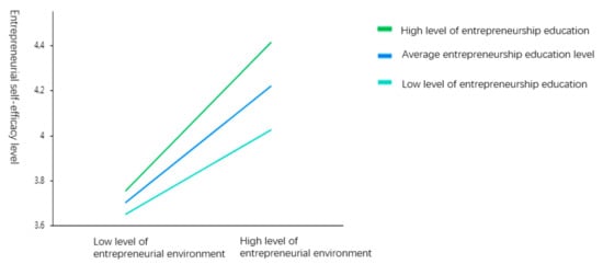 The multiple regression analysis found that entrepreneurial education and entrepreneurial environment have a significant predictive effect on entrepreneurial self-efficacy, and that entrepreneurship education plays a role in the process of entrepreneurial environment affecting entrepreneurial cognition []. Moderating effect refers to how the causal relationship between two variables changes with the value of moderating variables. It shows the cross-term B of variables under the influence of main effect variable B on variable A × effect of C on variable A []. According to the role of entrepreneurship education on the impact of entrepreneurial environment on entrepreneurial cognition, this study assumes that entrepreneurship education has a moderating effect and tests the moderating effect.