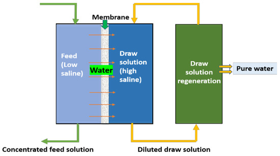 In the FO process, the major role was given for a draw solution, since its characteristics will control the water transport through the membrane and the regeneration of potable water. Conventionally, NaCl and MgCl2 are used as DS in RO regeneration, till now, and numerous draw solutions of organic solutes, inorganic solutes, volatile salutes, polyelectrolytes, bio-waste materials, and nanoparticles were studied; however, there is a need to fill some voids to meet the ideal DS. The majorly governed factors for an ideal DS are availability, cost effectiveness, high flux rates, reduced fouling potential, low reverse solute diffusion, non-toxicity, and ease of recovery/regeneration [41]. Hence, most of the current research is focused on developing such an ideal draw solution for FO technology.