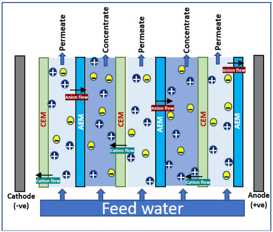 In electrodialysis, an alternating series of cation and anion selective semipermeable membranes (ion exchange membranes—IEM) are placed in between cathode and anode; clean water is produced by the electrochemical separation of ions, i.e., ions in solution are separated by the influence of electric potential. A schematic diagram illustrating the principle of electrodialysis process is shown in Figure 2. The brine solution is passed through into the cells in the ED system; the voltage gradient makes the movement of anions and cations through the selective membranes to anode and cathode, respectively. The cation-exchange membranes (CEM) allow the cations to block the anions; similarly, anions get passed through anion-exchange membranes (AEM) and cations are blocked. This leads to the complete separation of ions in brine, and ends up in ion enrichment at one side and freshwater recovery in another side. All cations such as Na+, K+, Mg2+, and Ca2+ and all anions such as chlorides, sulfates, and nitrates are found to be separated effectively from brine using ED technology.