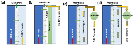Schematic representation of various configurations of MD, (a) direct contact, (b) air gap, (c) cold sweep gas, and (d) vacuum membrane distillation.