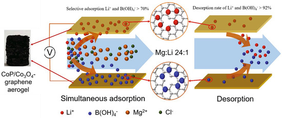 - Jin, W.; Hu, M.; Sun, Z.; Huang, C.H.; Zhao, H. Simultaneous and Precise Recovery of Lithium and Boron from Salt Lake Brine by Capacitive Deionization with Oxygen Vacancy-Rich CoP/Co3O4-Graphene Aerogel. Chem. Eng. J. 2021, 420, 127661. [Google Scholar] [CrossRef]