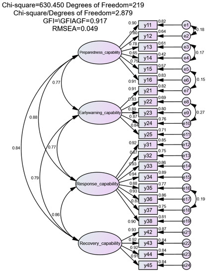 In terms of the relationships between the latent variables, the correlation coefficients between “preparedness”, “early warning”, “response” and “recovery” were all above 0.75 and the p-value was 0.000, indicating that there was a strong correlation between the four latent variables. There could be another higher-order public latent variable above the four latent variables. They jointly measured the same latent variable: local government environmental emergency management capability. Therefore, using a measurement model (CFA) for the study was more appropriate.