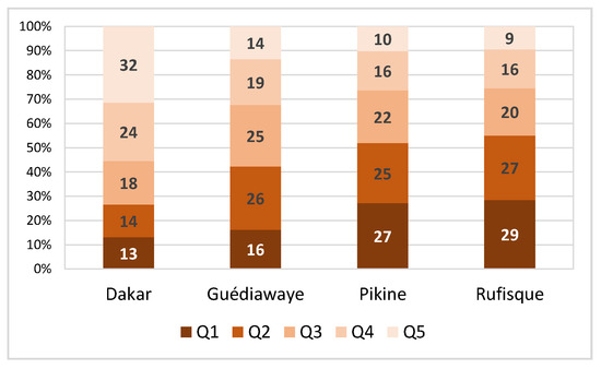 The working population of the departments of Pikine and Rufisque are more likely to have non-salaried jobs (this applies to two-thirds of them) than that of Guédiawaye and Dakar (three-fifths and one-half, respectively). More of them work in the informal economy. Their median income is lower (CFAF 75,000 (CFAF 1000 = EUR 1.5) per month) than in Guédiawaye (CFAF 91,000) and Dakar (CFAF 108,000). A majority of households in Pikine and Rufisque are in the low (Q2) or very low (Q1) income groups (Figure 2).