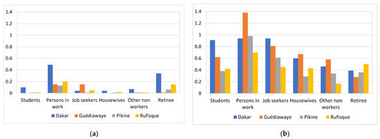 Nearly six out of ten jobs are located in the department of Dakar, and many of them are in the city center, at the tip of the peninsula. This separation between places of employment and places of residence results in long commuting distances. Working people and job seekers are the most likely to use a motorized mode, especially those living in Dakar and Guédiawaye (Figure 3a,b).