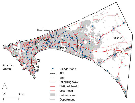 Location of the Clando stands in the region of Dakar (map by the authors).