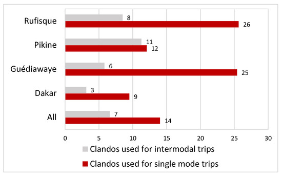 Clandos are often used for daily activities aside from professional activities. When people use public transport to go to the public dispensary, to the market, and for formalities, it is frequently a Clando (Table 3). For higher-level health services, such as hospitals and clinics, the distances are generally longer, which limits the number of single-mode Clando trips and frequently requires an intermodal trip. Likewise, single-mode Clando trips are responsible for a relatively small proportion of commuting trips because of the greater distances involved, their frequency, and the expense involved.