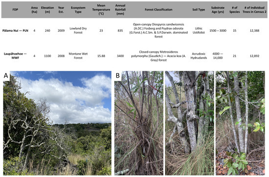The Hawaii Permanent Plot Network (HIPPNET; http://www.hippnet.hawaii.edu/; accessed on 25 May 2022), a member of ForestGEO (https://forestgeo.si.edu/; accessed on 25 May 2022) consists of four forest dynamics plots located across a steep rainfall gradient, and was established in 2008 as a platform to investigate forest and climatic processes in Hawaii. The two plots included in this study, Laupāhoehoe (LAU), a montane wet forest (MWF, established in 2008), and Pālama Nui (PLN, established in 2009), a lowland dry forest (LDF), are 4 hectares in size (Figure 1). The Pālama Nui LDF is an example of one of the world’s most endangered forest types. The FDP is located on the northwest slope of Hualālai Volcano in the district of North Kona (240 m elevation, 19°44′ N, 155°59′ W). Over the last 200 years, much of the LDF in Hawaii has been subjected to grazing and browsing by exotic ungulates, with remnants impacted by wildfire facilitated by non-native grasses [31]. Cumulatively, these disturbance patterns have greatly reduced the native forest from its original extent [32]. Although the area containing the FDP has not been burned or significantly browsed by ungulates, the surrounding area is a matrix of degraded LDF and open grassland. In 2009, a fence and firebreak were installed around the area to protect it from ungulates and fire.