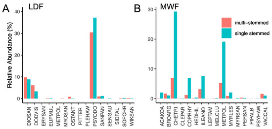 Relative abundance of multiple-stem and single-stem trees across both lowland dry forest (LDF) and montane wet forest (MWF). Panel (A) represents the relative abundance (%) of multiple-stem and single-stem trees within the LDF. Panel (B) represents the relative abundance (%) of multiple-stem and single-stem trees within the MWF. A full species list can be found in the Supplemental Information.