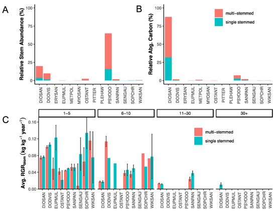 Multiple-stem and single-stem comparisons within the LDF. Panel (A) highlights species-level patterns in relative stem abundance (%) by stem habit. Panel (B) highlights species-level patterns in relative aboveground carbon (%) by stem habit. Panel (C) highlights species variation in mean values of relative growth rates (RGRbiom) by tree size class. Error bars represent ±1 standard error of the mean. A full species list can be found in the supplemental information.