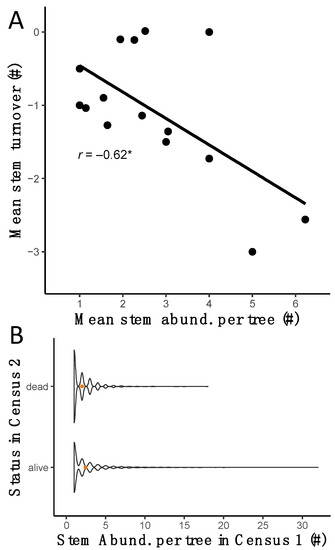 Temporal patterns relating stem abundance to stem turnover and survival. Panel (A) shows the correlation across species between mean values of stem abundance per tree in census 2 and stem turnover per tree between census 1 and census 2. r represents Pearson’s correlation coefficient; * p < 0.05. Shaded area represents 95% confidence interval. Panel (B) shows a violin plot depicting differences in stem abundance (#) in census 1 by tree status (i.e., alive or dead) in census 2. Orange point and error bars represent mean ± one standard error of the mean.