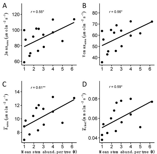 Functional trait–stem trait correlations. All four panels show the correlation across the 15 species in the LDF between mean values of stem abundance per tree and estimates of electron transport rate (Panel A), maximum carboxylation rate (Panel B), leaf CO2 assimilation rate (Panel C), and stomatal conductance (Panel D). r represents Pearson’s correlation coefficient; * p < 0.05, ** p < 0.01. Shaded area represents 95% confidence interval. Estimated stomatal and photosynthesis traits are publically available and described in depth in [42].