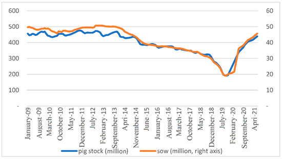 China’s pig and sow herds: 2009–2021. Data source: www.gov.cn. (accessed on 16 January 2022).