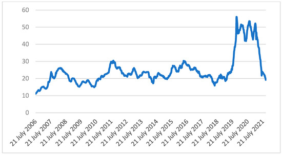 Average pork prices in China: 2006–2021 (CNY/kg). Data source: www.caaa.cn. (accessed on 16 January 2022).
