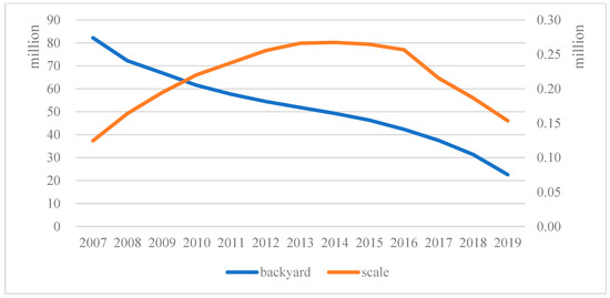 Numbers of pig farms with backyard operation (<50 pigs per farm) and scale operations (>50 pigs per farm). Source: China Animal Agricultural Year Books (various issues).