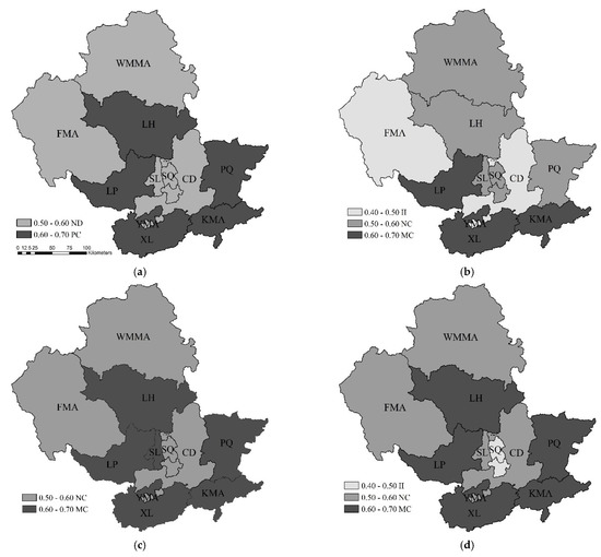 - The CCD of 11 administrative regions in Chengde City was at the three levels of imminent imbalance, near coordination, and primary coordination under the four scenarios. Compared with the business-as-usual scenario, the CCD level of all administrative regions in Chengde City decreased significantly under the economic-led scenario, while there was no significant change in the level of CCD under the social-led scenario and environment-led scenario. For different types of administrative regions, under different scenarios, there is no significant correlation between the coupling coordination degree of each administrative region and the spatial differences in administrative regions.