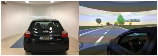 Drivers’ behavior was characterized by means of the STI driving simulator, available at the Virtual Reality Laboratory of University Research Centre for Road Safety (LASS3, Figure 2). The reliability of the complete facility was fully validated [22,23]. The simulator was installed within a real vehicle in an effort to ensure a high feeling of reality during the experiments. The virtual scenario was projected in front of the car and sideways, covering a 135 degree visual angle; sound speakers in the motor hood emulated the acoustic environment.
