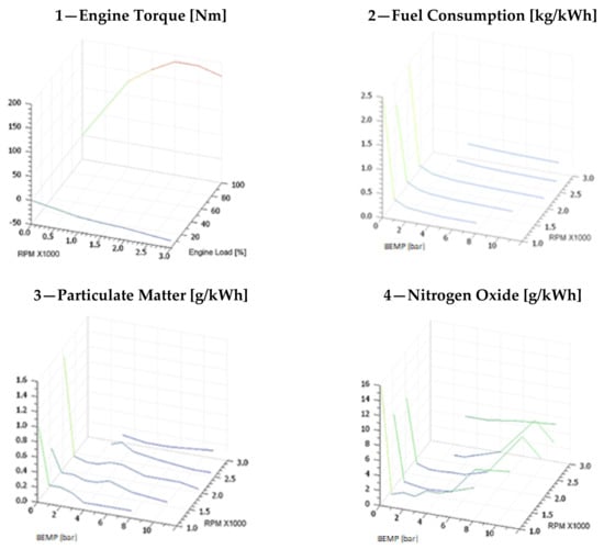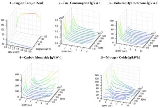 In principle, the uncertainty that accompanies the data contained in the maps is linked to two factors. On the one hand, there is the uncertainty associated with the experimental torque and emissions measurements for each engine, and on the other, there is the uncertainty, or the approximation, deriving from the fact that the chosen map is assumed to be representative of the engines belonging to the same category. The influence of such uncertainties would obviously affect the final forecast of vehicle emissions, but considering the objectives of the present work, here it was not taken into consideration because these uncertainties were assumed to be independent of the driver’s driving style.