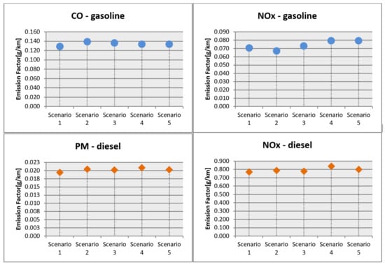 As shown in Figure 6, regarding the gasoline vehicle, pollutant emissions were calculated in terms of NOx and CO (the different behavior of the trends is due to the TWC operation). Regarding the diesel vehicle, more moderate reductions and increases were recorded, both for NOx and PM.