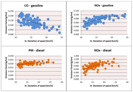 Regarding the diesel vehicle, differences in terms of consumption were more contained, showing poor correlation between consumption and vehicular interference. In the same way, emissions were less influenced by the phenomena of acceleration and deceleration. The same conclusions were also attained considering the speed variations through the analysis of the standard deviation, or rather, analyzing how much the instantaneous speed values were dispersed from the mean. As shown in Figure 7, the correlation between the standard deviation and emissions could be approximated by a parabola.