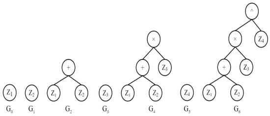 To decode the chromosome, it should be read from the top node to the bottom node. It can be seen from the above example that the genes 0, 1, 3 and 5 encode a simple expression with a single terminal, i.e., Z1, Z2, Z3 and Z4, respectively [22]. The expressions for these genes are shown in Equation (1).