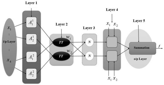 Layer 4 is an adaptive layer in which each node represents a consequent part of the fuzzy rule. The outputs are the products of the weights (normalized) into the node’s function, which can be represented as given below [24]: